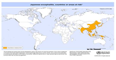 The main risk areas are in China, the Korean peninsula, the Indian subcontinent and SE Asia. Major epidemics have occurred in the past in China, Korea, Japan, Taiwan and Thailand. Periodic epidemics continue to occur in Vietnam, Cambodia, Myanmar, Laos, India, Nepal, the Philippines and Malaysia. JE has occurred in lower frequency in Singapore, Hong Kong, Eastern Russia, Guam, Saipan, Brunei and the Torres Strait Islands.